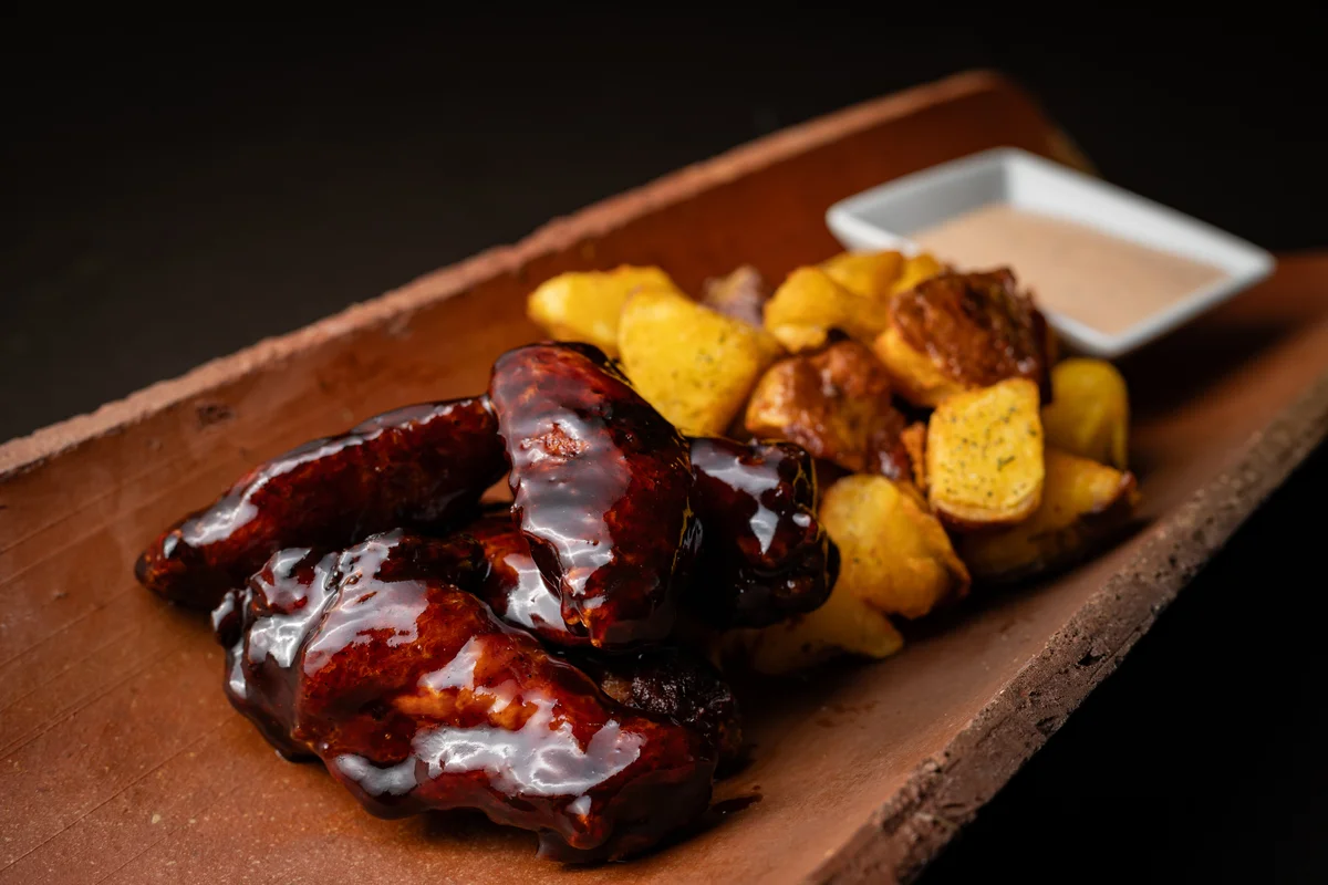 Deliciosas alitas crocantes bañadas en cualquiera de nuestras salsas bbq caseras (tradicional, miel y mostaza).