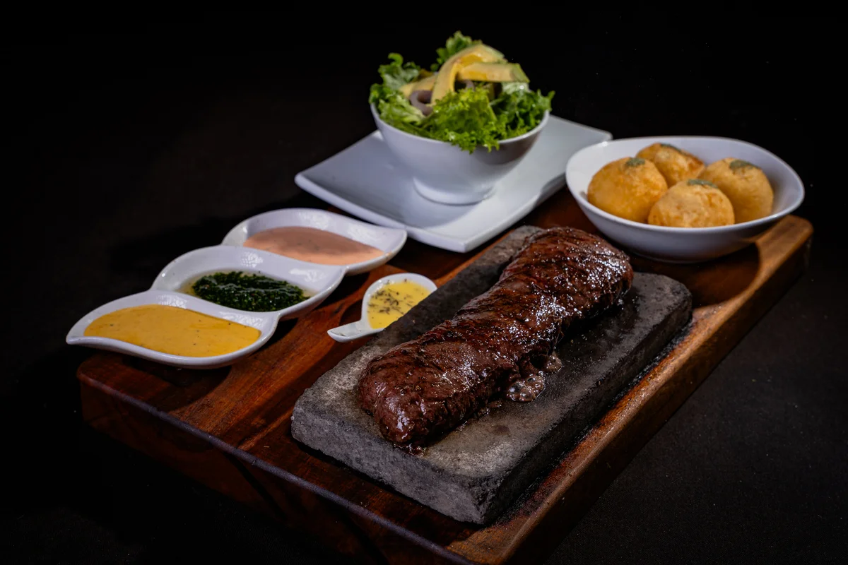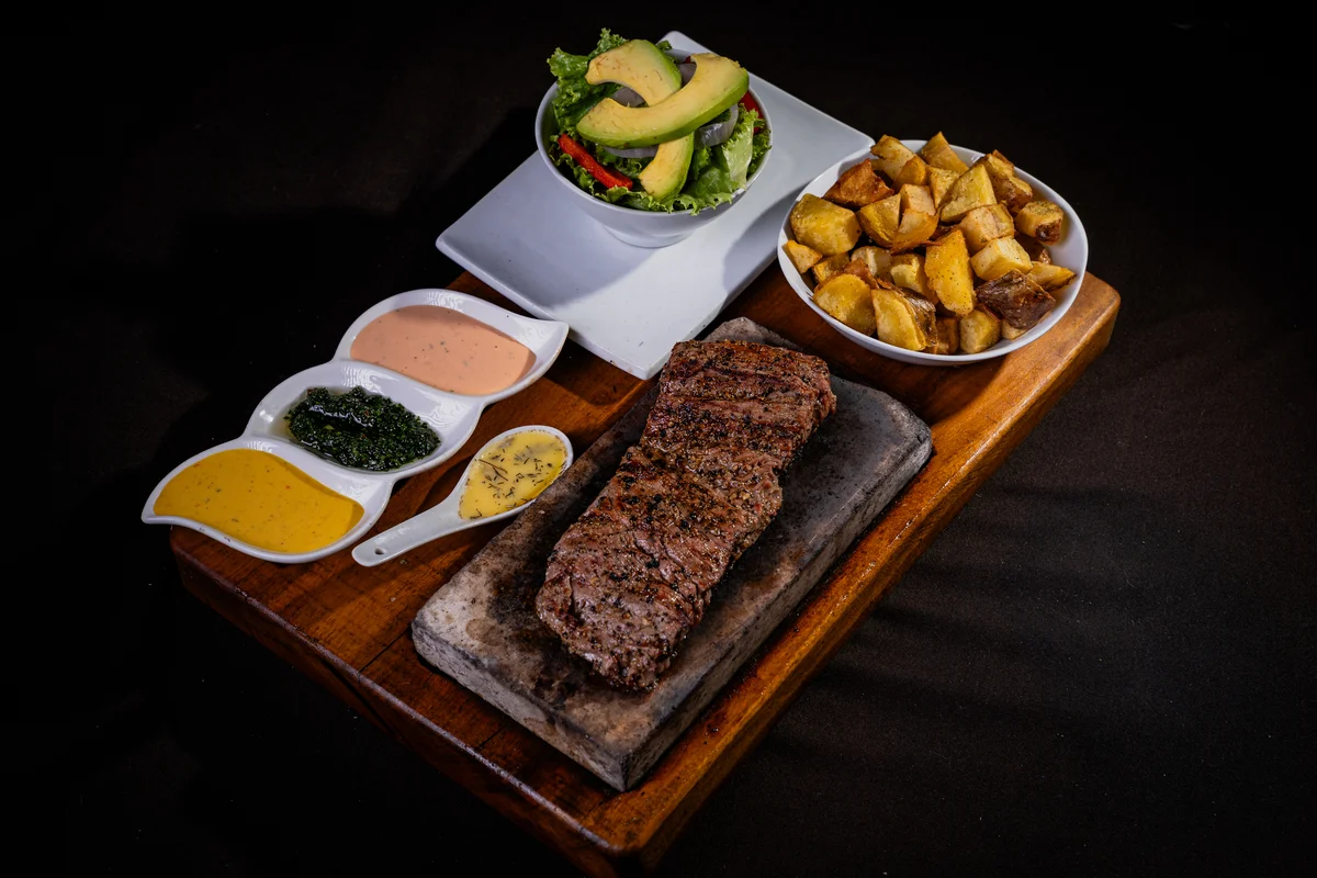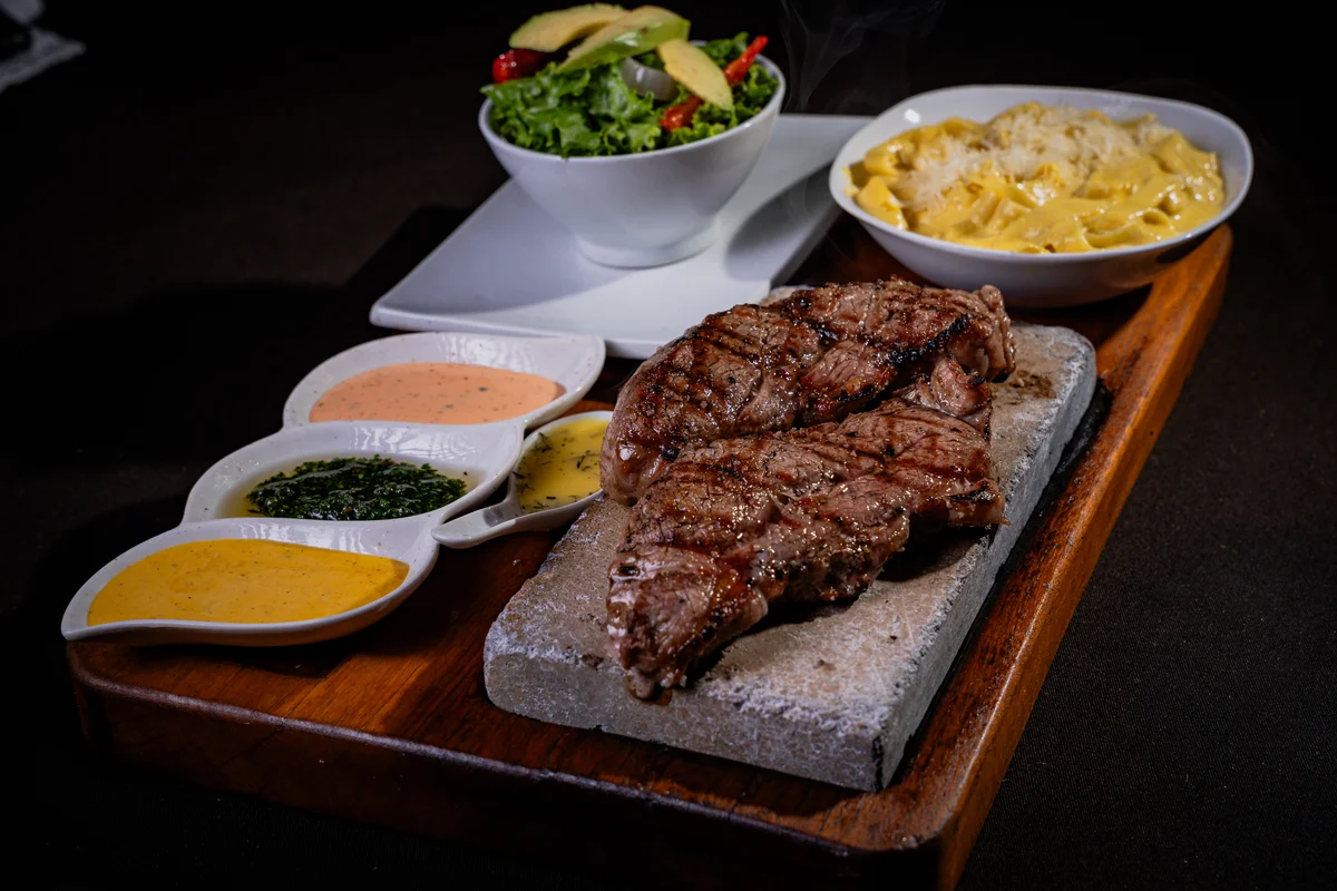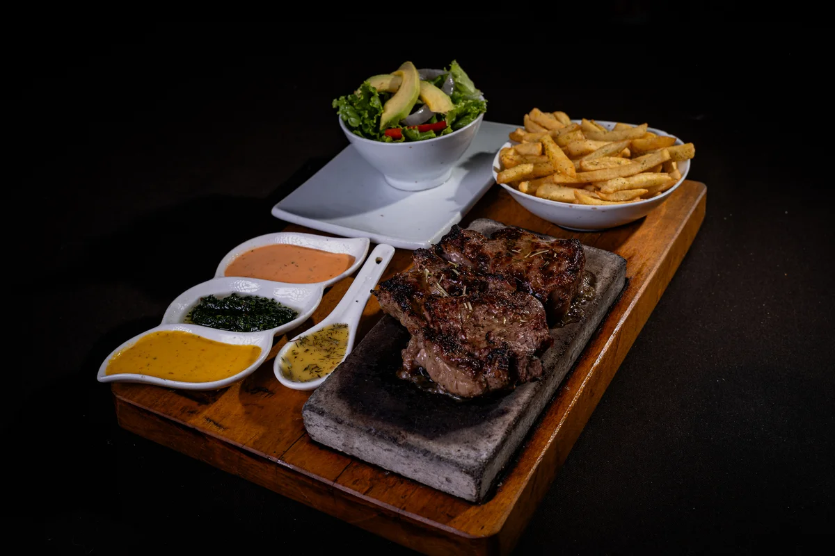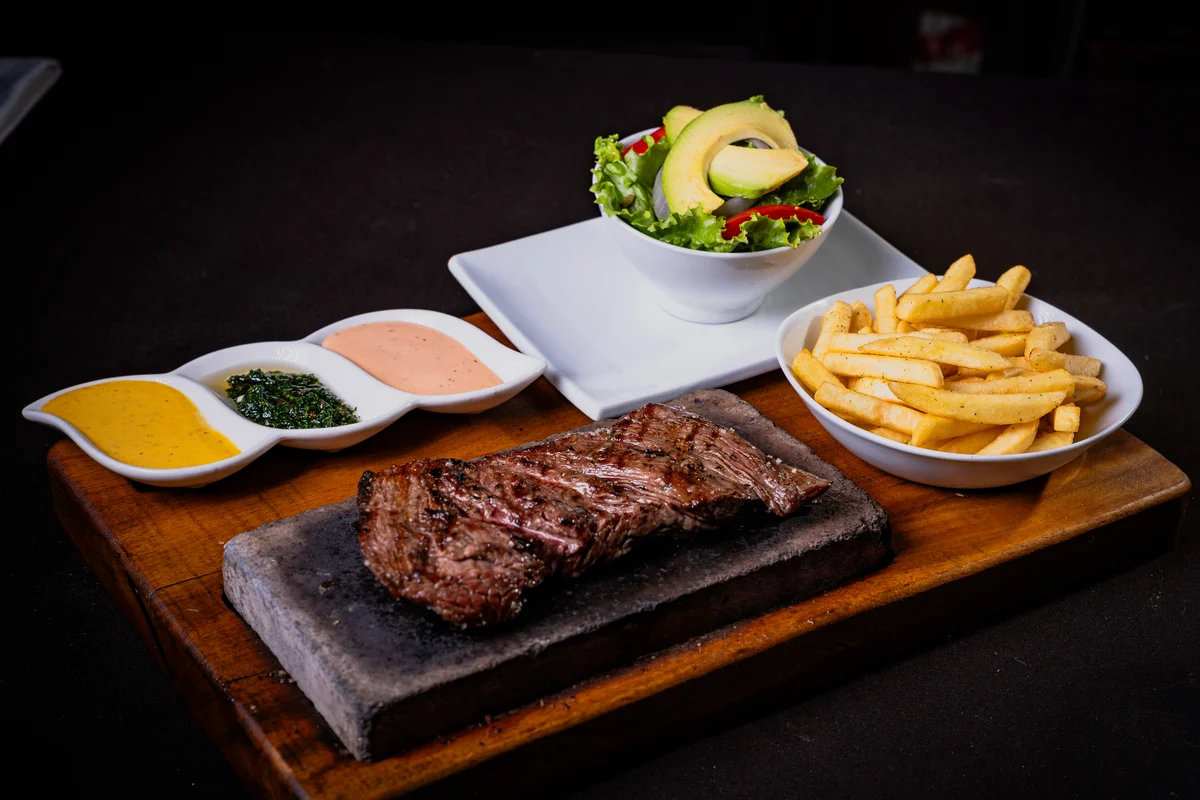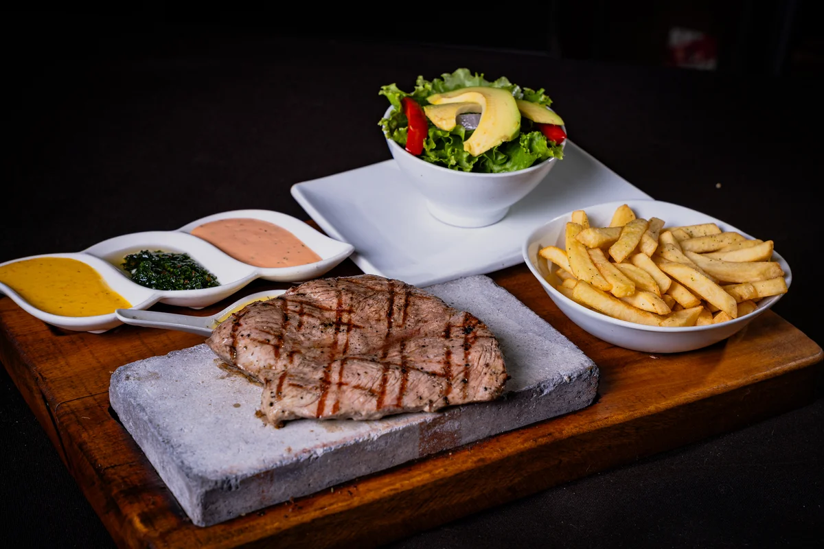 Toda carne a la piedra volcánica viene acompañado de una porción de guarnición y ensalada de la casa.