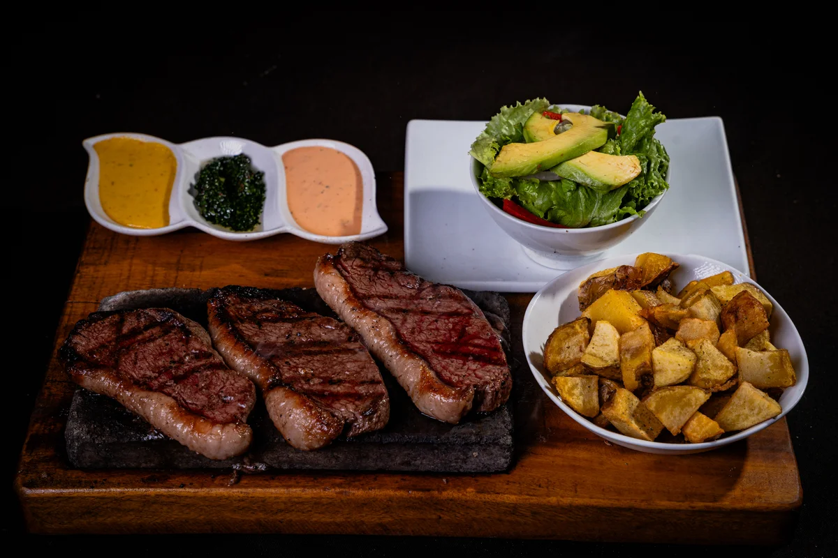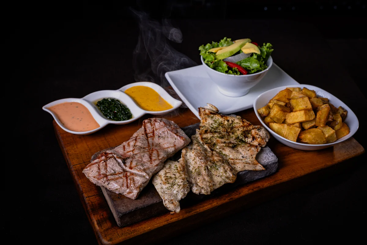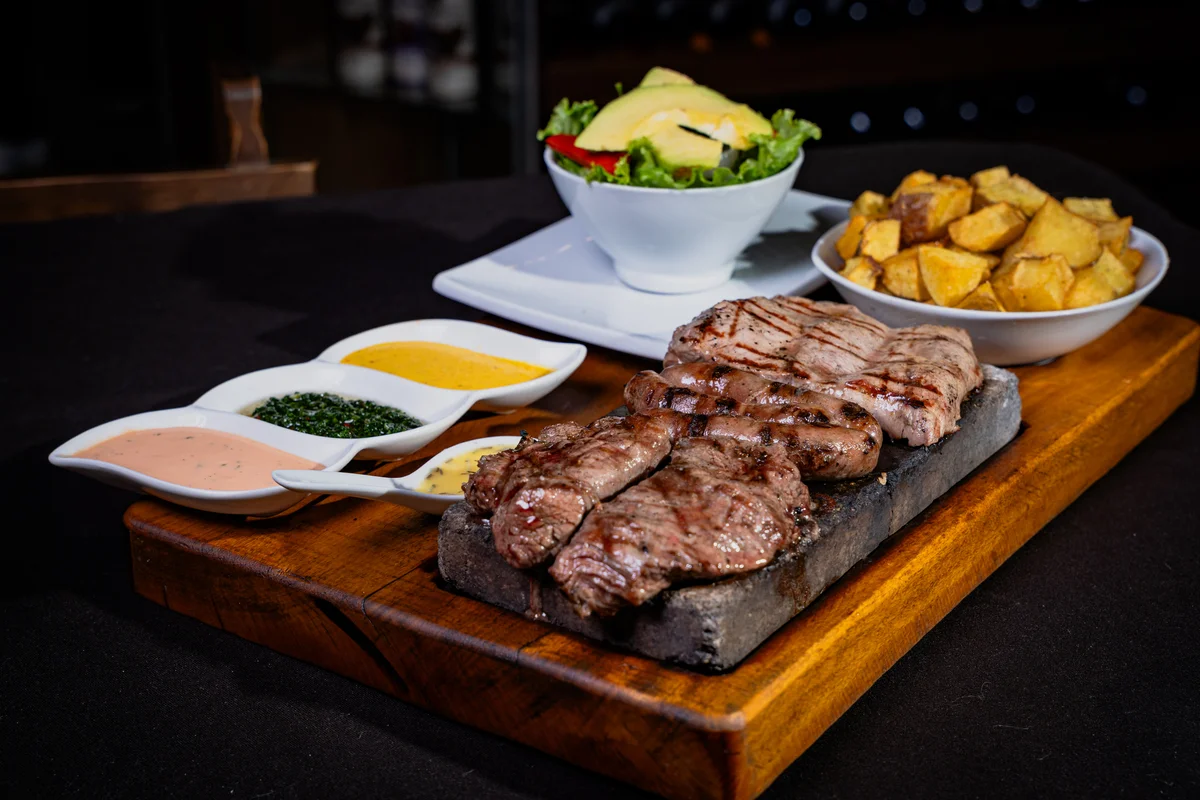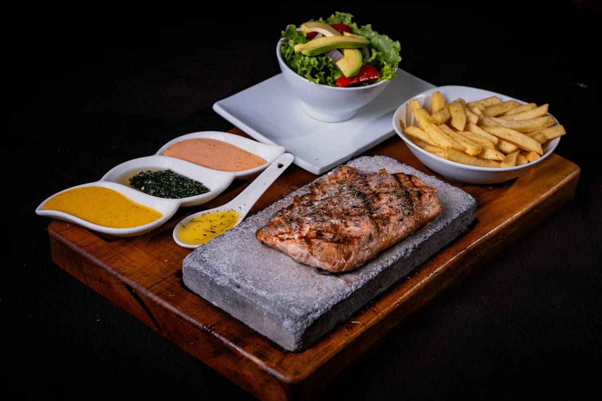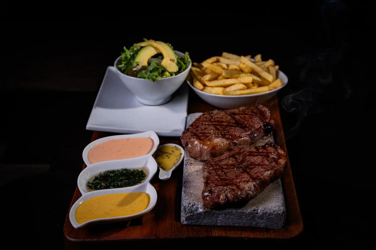 Toda carne a la piedra volcánica viene acompañado de una porción de guarnición y ensalada de la casa.