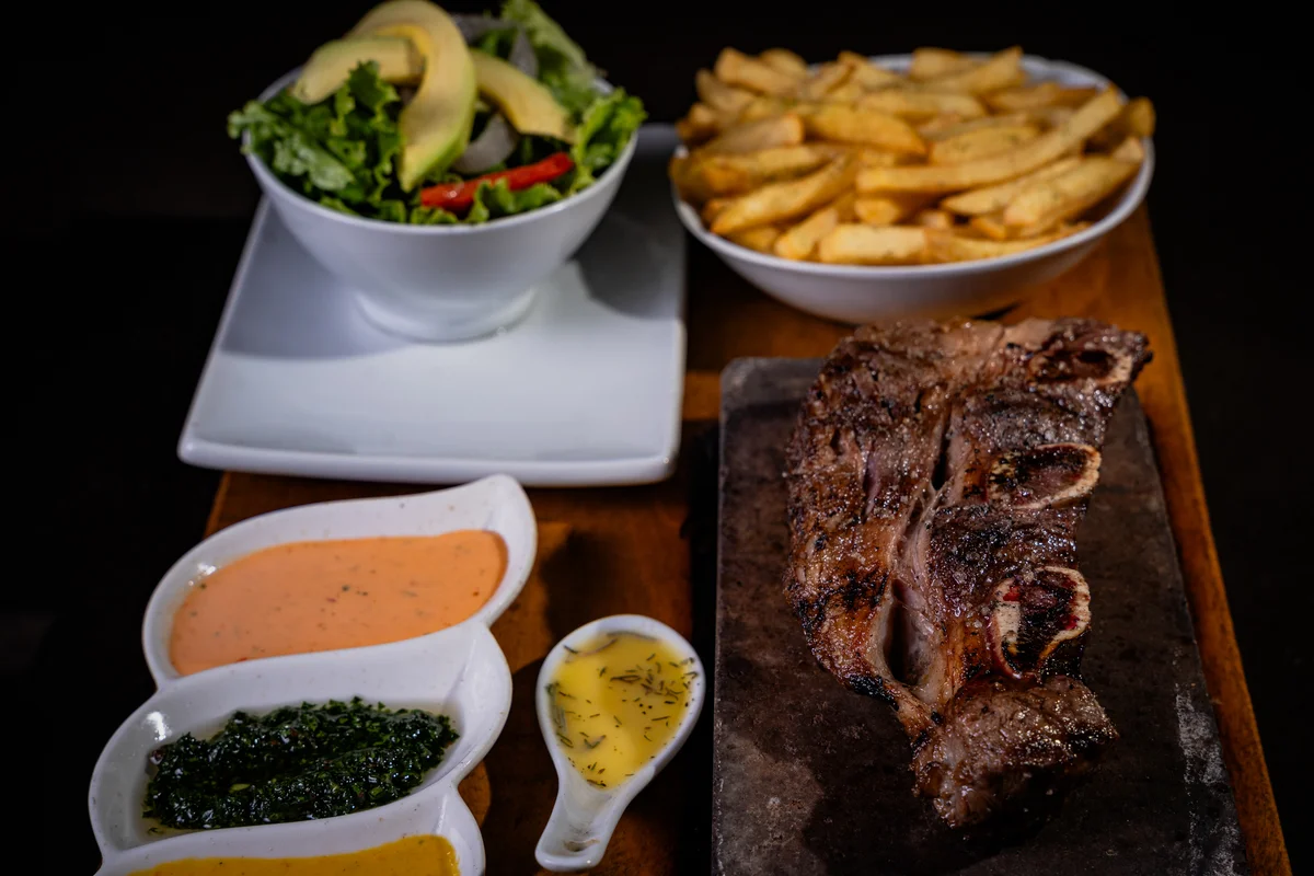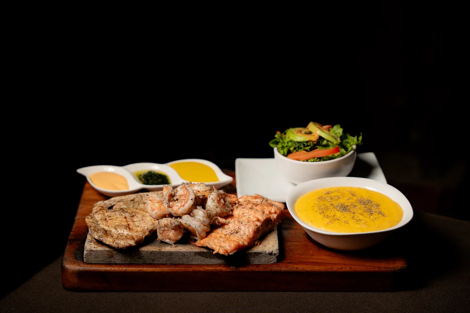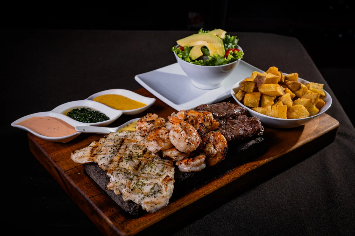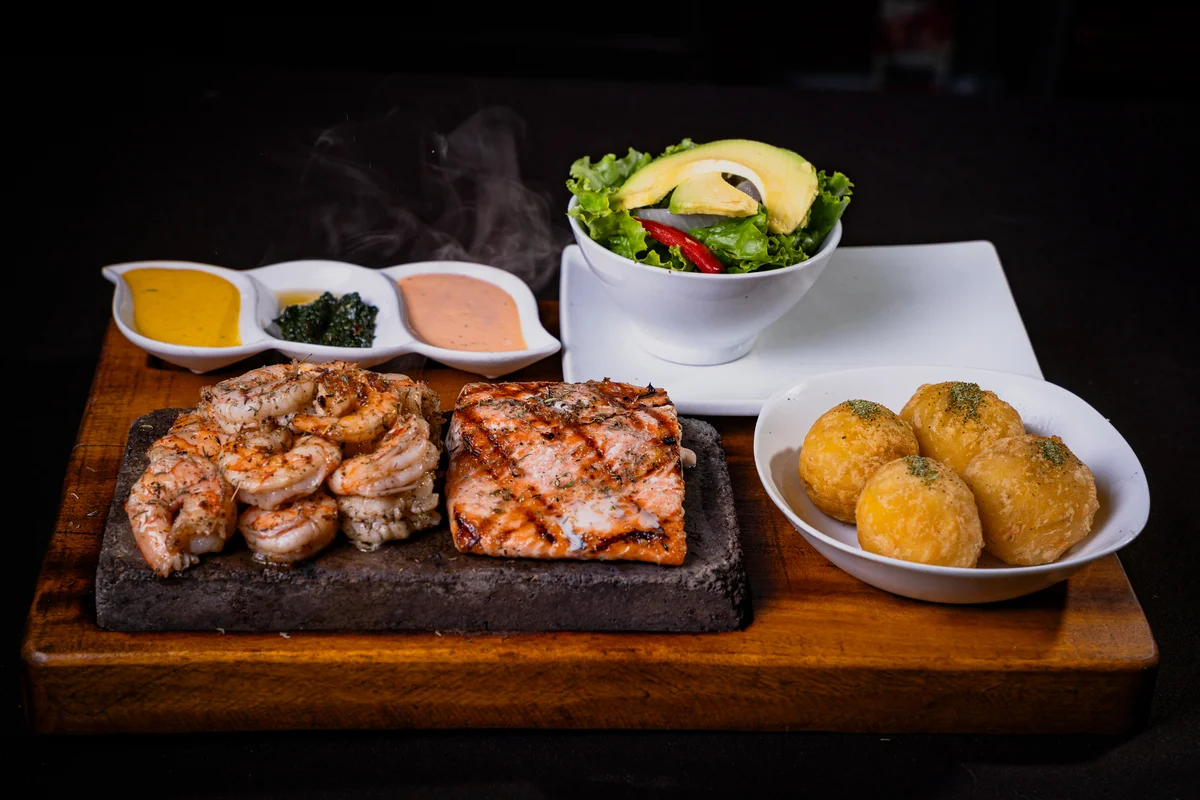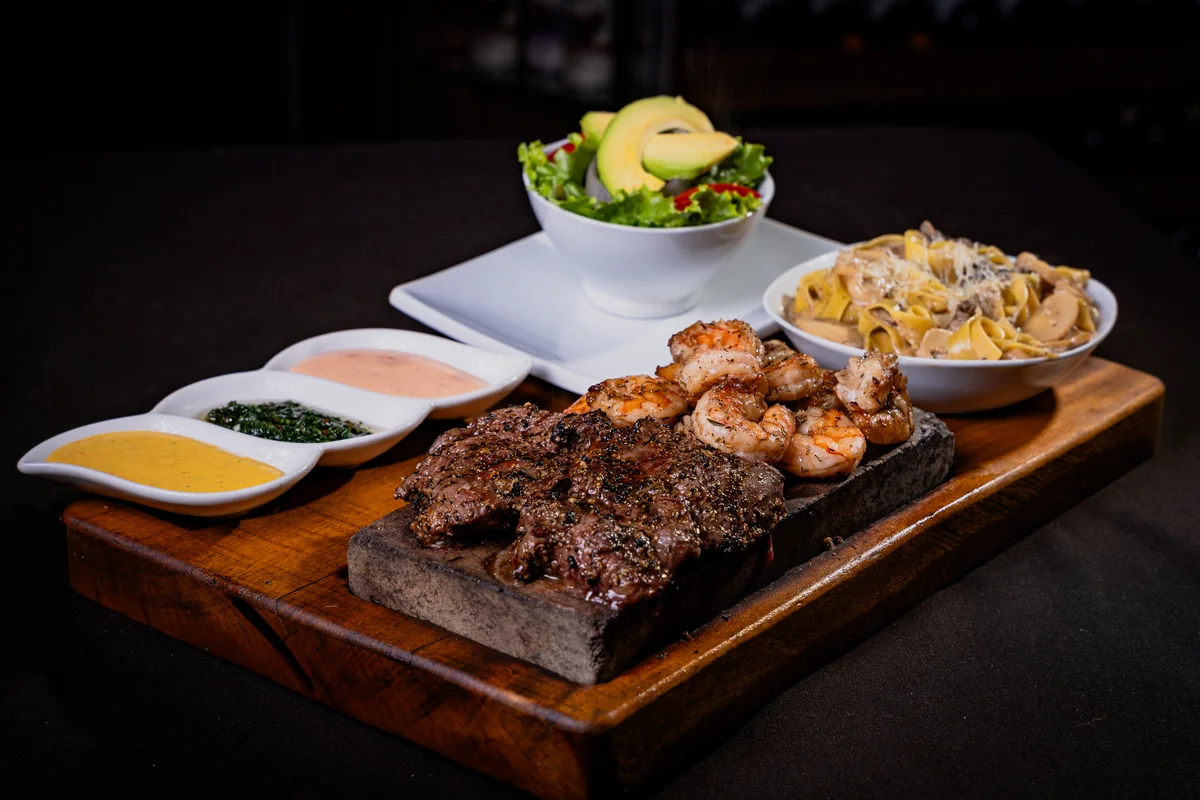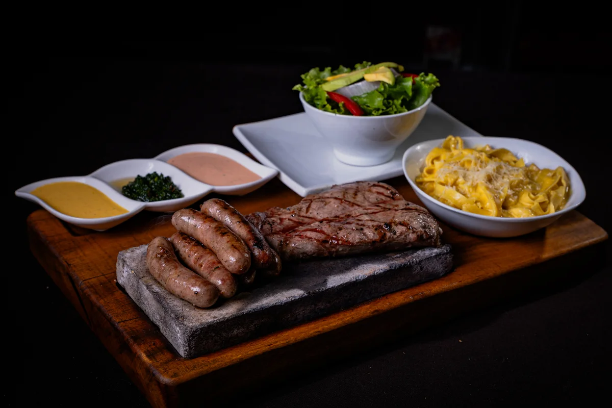 Toda carne a la piedra volcánica viene acompañado de una porción de guarnición y ensalada de la casa.