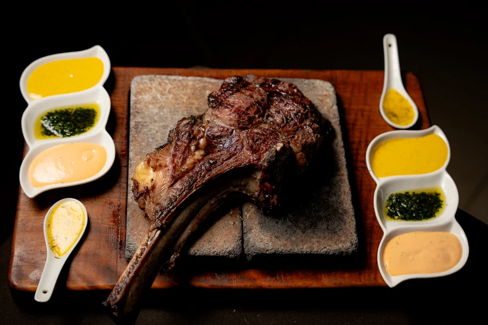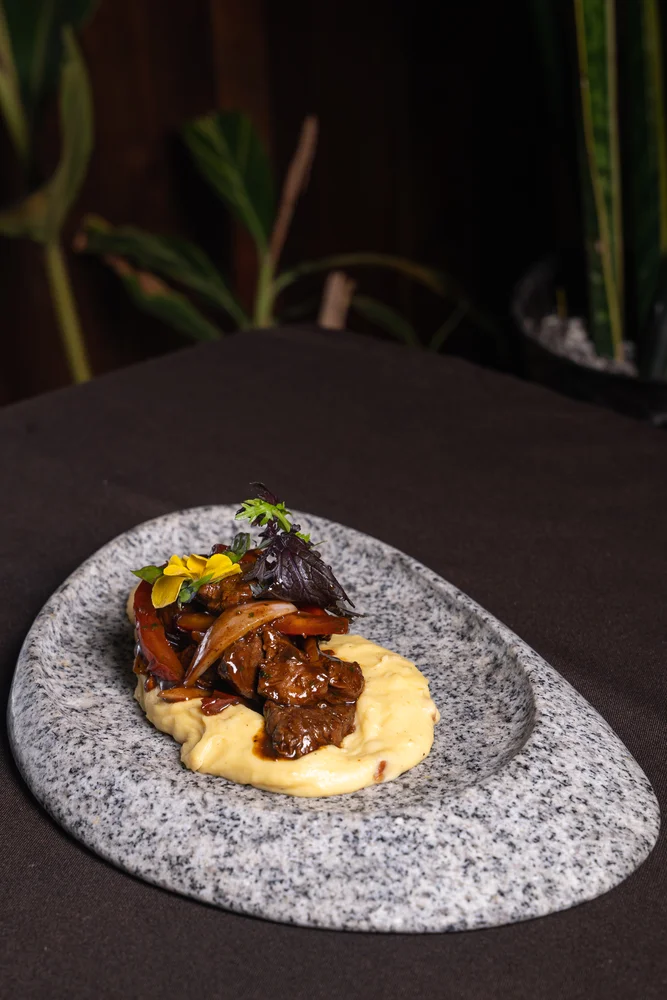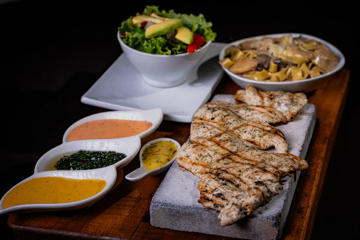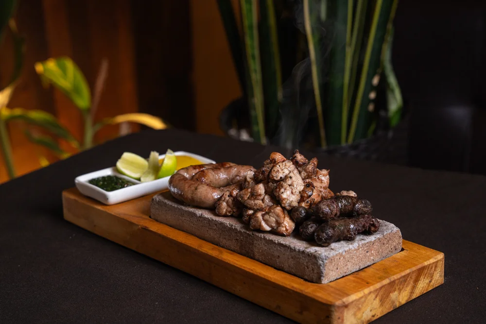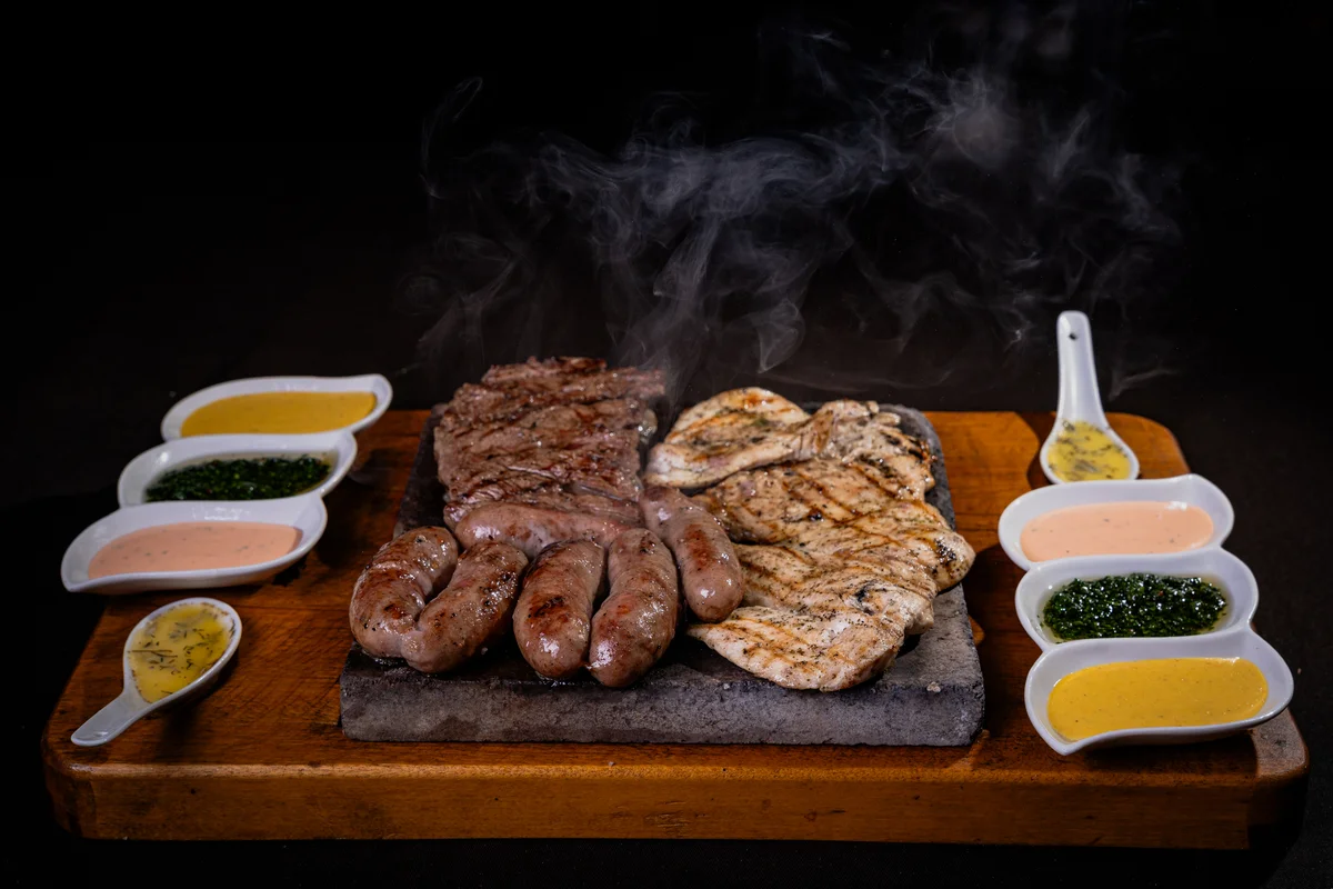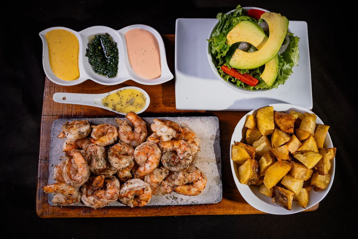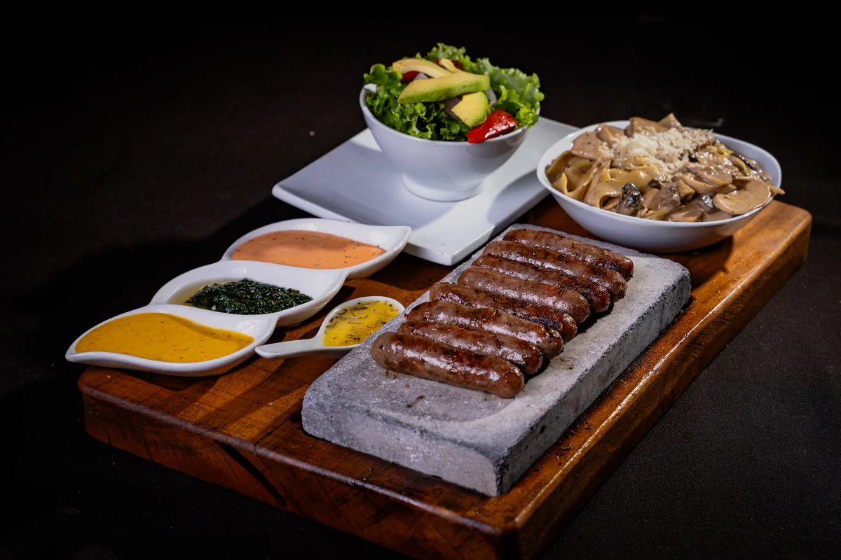 Toda carne a la piedra volcánica viene acompañado de una porción de guarnición y ensalada de la casa.