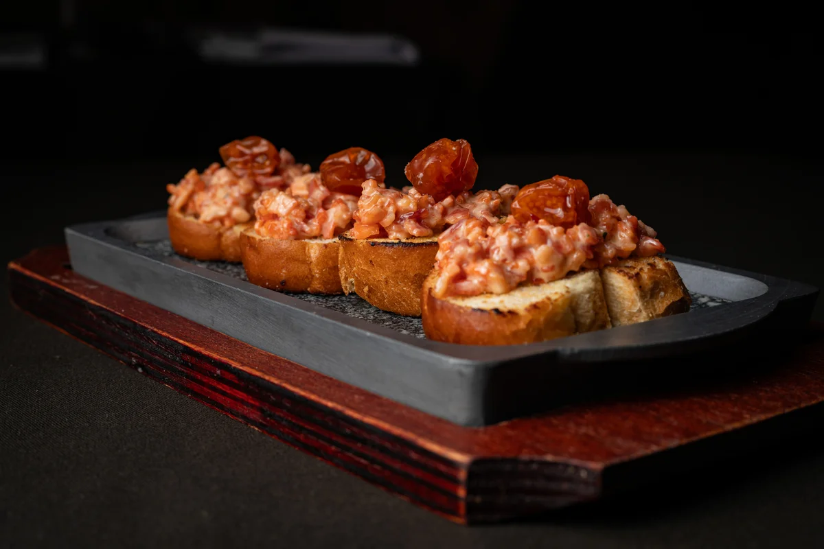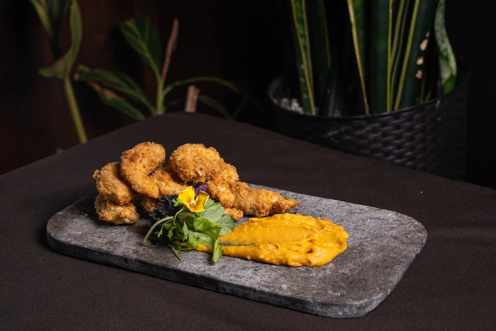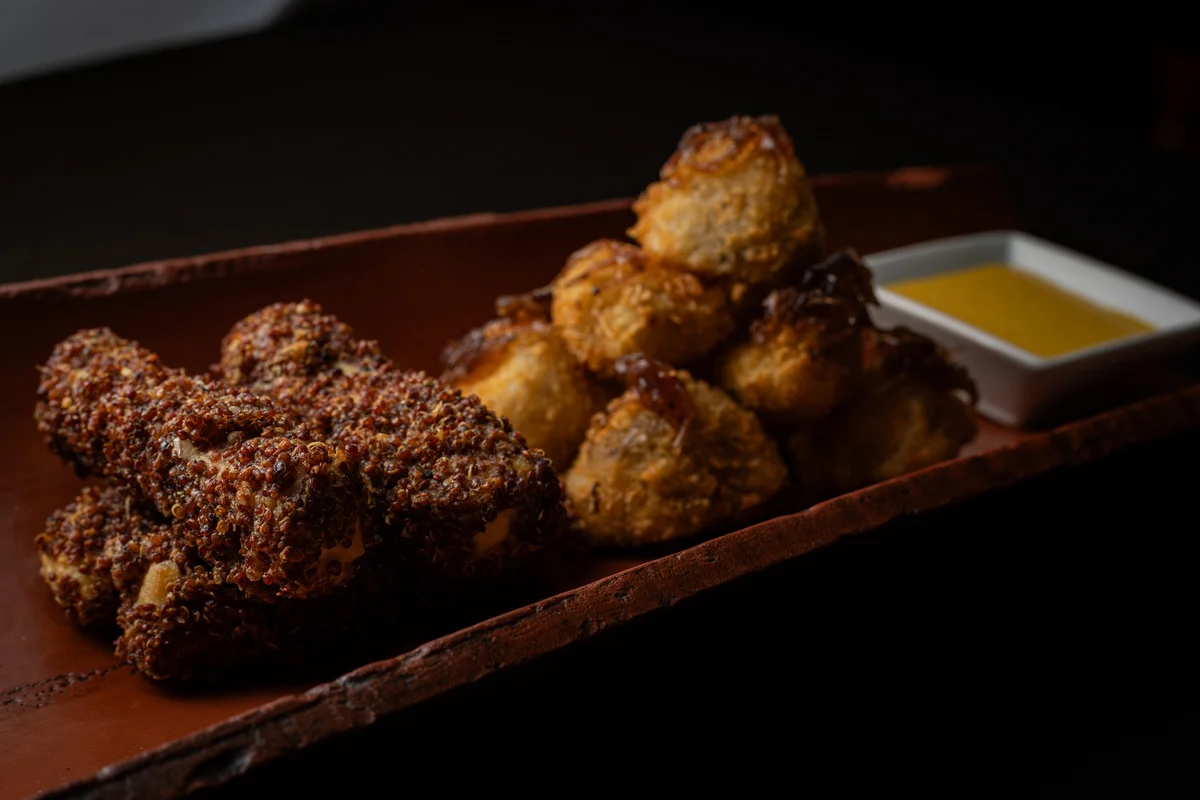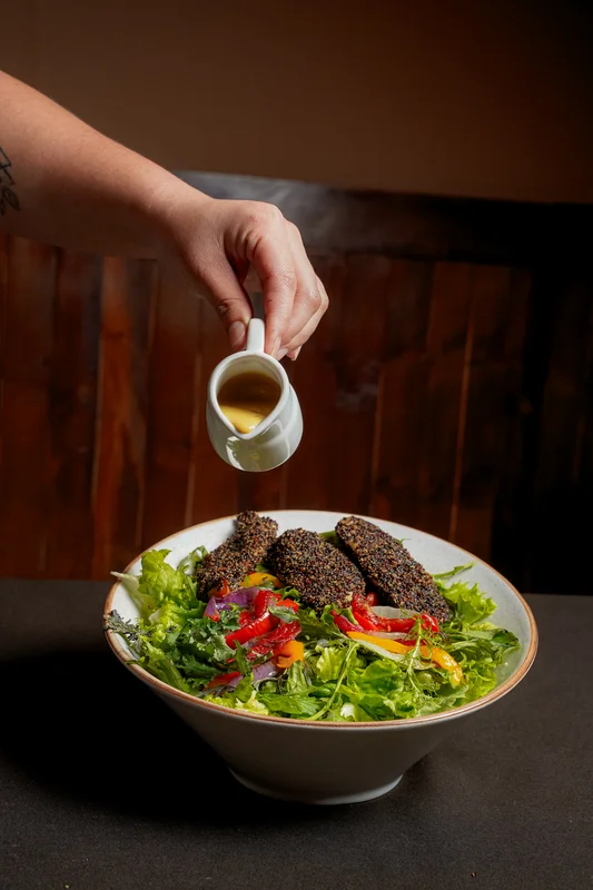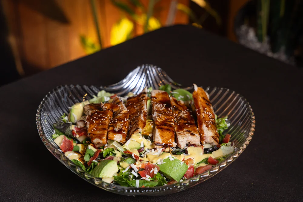 Un tartar de mando con palta acompañado de lechugas orgánicas tomate confitado, pimineot y cebollas a la parrilla, pollo empanizado con quinua negra y bañado con nuestra salsa de miel y mostaza.