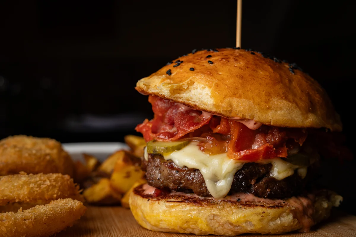 200 gr. de carne molida sazonadas con especias de la casa, queso andino, cebollas caramelizadas al tocino, pepinillos encurtidos, tomate confitado coronada con láminas de tocino, servido en nuestro pan brioche casero acompañado de papas andinas y cebollas fritas.