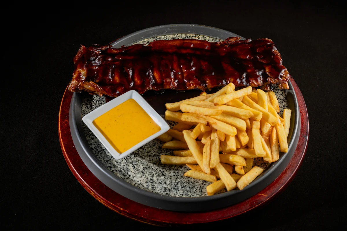 Deliciosas costillas de cerdo cocidas por nueve horas y bañadas en una de nuestras salsas artesanales(tradicional, miel y mostaza). Puedes elegir una de nuestras guarniciones para acompañar tus costillas