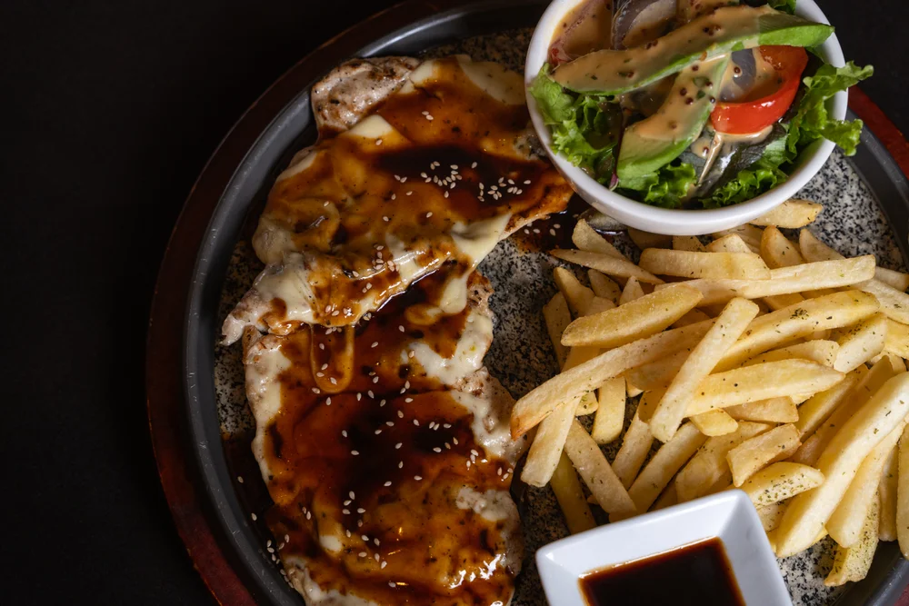 Filete de pollo a la parrilla cubierto con salsa barbacoa y gratinada con queso andino acompañado de papas fritas.